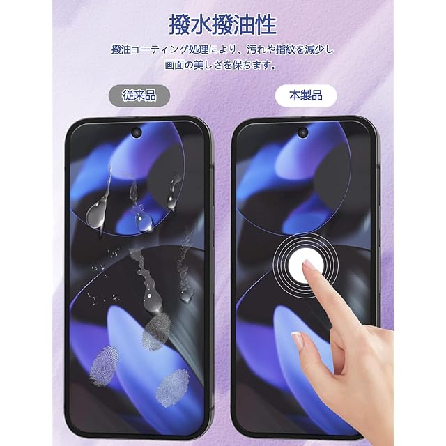 【指紋防止、高感度タッチ】ガラスフィルムには撥油コーティングが施されており、指紋や汚れなどに強くなめらかな操作感を実現、付着した汚れなどは簡単に拭きとれます。こちらは高耐久撥油コーティングが施され、つるつるな滑り感を実現!ゲームしても渋くなし!