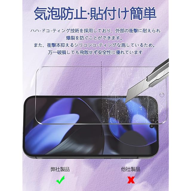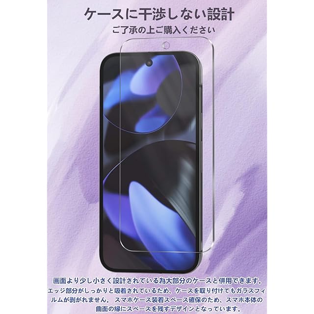 <p> <strong>【対応機種】</strong>Google Pixel 9/9Pro ガラスフィルム2枚。ガイド枠が付属しているため、貼り付け時に保護フィルムの位置決めが簡単で、ズレることもありません。 ご購入前に必ず機種をご確認ください。 </p> <p> <strong>【9H硬度・日本製ガラス素材】</strong>日本旭硝子製ガラス素材採用 最上級強度のガラスを使用し表面硬度は9H。万が一スマホを落としてガラスが割れても、 ガラス破片が飛び散らないような安心設計。 飛散防止 、ガラス破片から守ります。 </p> <p> <strong>【申し分ない透明感】</strong>画質を徹底して追求するため、最高級のガラスを選択し、透過率を実現しました。透き通ったガラスフィルムに多層フィルタフィルムを採用し、素晴らしい透明度を確保して、一体感になって、まるで貼っていないみないような感覚で携帯の美しさはそのままにお楽しみいただけます。 </p> <p> <strong>【指紋防止、高感度タッチ】</strong>ガラスフィルムには撥油コーティングが施されており、指紋や汚れなどに強くなめらかな操作感を実現、付着した汚れなどは簡単に拭きとれます。こちらは高耐久撥油コーティングが施され、つるつるな滑り感を実現!ゲームしても渋くなし! </p> <p> <strong>【気泡防止・貼付け簡単】</strong>気泡防止加工が施されているので、気泡が入りにくい。万が一気泡が入ってしまっても時間が経てば徐々に抜けるので 美しい仕上がりに。ガラスを液晶に置くだけで自然に吸着、簡単に気泡が抜いて行くので、誰でも簡単、綺麗に貼ることができます。フィルム貼りことが苦手の方でも簡単に貼る事が可能です。 </p>