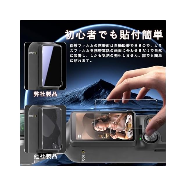 ☞【簡単に貼り付け】 DJI OSMO Pocket 3 保護フィルム の粘着面は特別な自動吸着層を使っており、ただ ガラス をカメラの画面に合わせるだけで自然に吸着し、しかも気泡の発生を防止します。ですからだから誰でも簡単に貼れます。フィルム貼り苦手な方におすすめです。【防水・防油・指紋防止】 ガラスフィルム の表面にナノコーティングとイオン性撥油防水コーティングしており、通常のフィルムのようなザラザラ触り感じが一切ありません。更に超指紋防止、汗防止、持続爽快感などの優れる点を備えております。指紋が気になる方もサッと拭き取れます。【3Dタッチ対応】フィルムは0.26mmのゴールデンの厚さを設計して、指紋ロック解除などのタッチ感度と敏感で、正確なタッチと連続タッチを確保し、高感度で快適な操作を実現します。