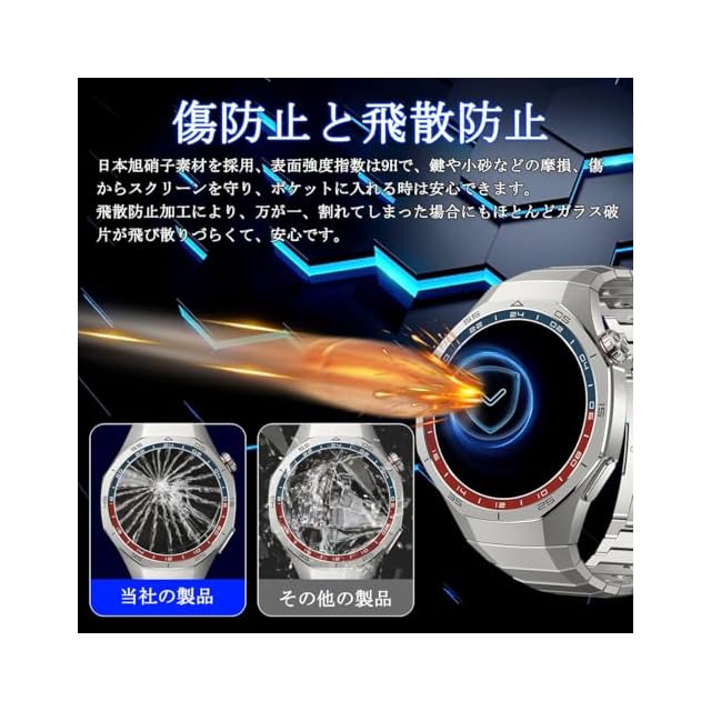 3【高品質の材料の9H硬度】スマートウォッチ保護フィルムの中で最高レベルの9H硬度に達しています、4.5時間以上の高温焼入れ処理を行い、スクリーンプロテクターの圧強度は 125mpa に達し、通常 ガラス の 5 倍になりました。しかもスクリーンプロテクターは衝撃を抑えるシリコンコーティングを内蔵しており、万が一ガラスが割れても、ガラスの破片が飛散しません。