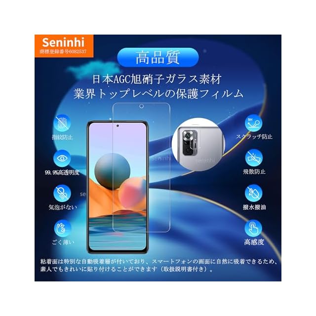 商品名:対応 Redmi Note 10 Pro ガラスフィルム レンズ保護フィルム 指紋防止 Note10Pro 強化ガラス 硬度9H 国産旭硝子AGC素材 気泡ゼロ 飛散防止 高感度 衝撃吸収 ラウンドエッジ加工 【2枚液晶保護フィルム+2枚レンズ保護フィルム】