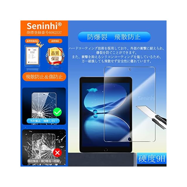 【優れるガラスを選択・硬さ9H+】 私たちの ipad 10.2in 9世代 2021 8世代 2020 7世代 2019 ガラスフィルムは業界最高レベルの硬さ9H+を使っており、4.5時間以上の高温処理加工しておりますので、ガラスフィルムは通常のガラスの硬さの5倍に達しました。シリコンコーティングを内蔵して、ショックを抑えることができ、画面への損害を最小限に抑えます。更に特別なデザインを使っており、保護フィルムがタブレットの画面をしっかり保護する同時にガラスが割れでも、ガラスの破片が飛びません。安心できます。