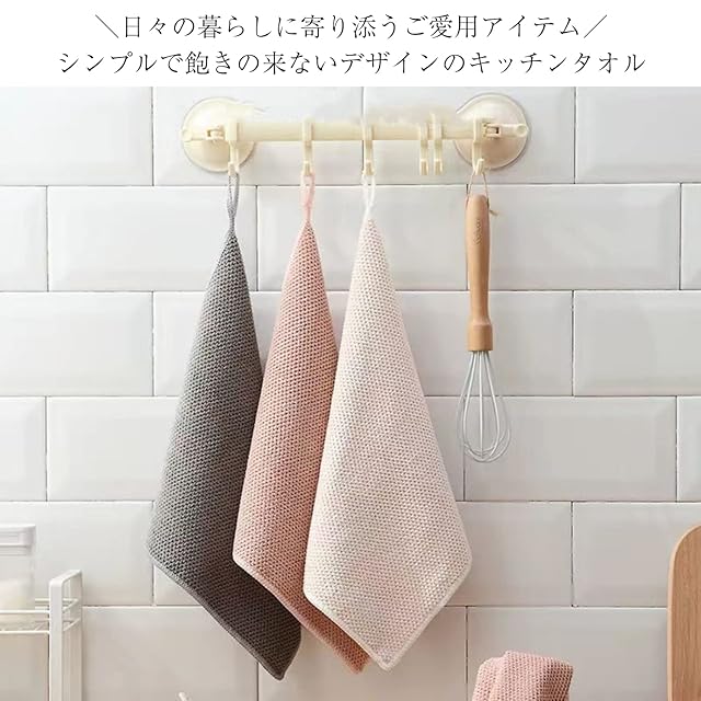 【使いやすいサイズ】台拭きあるいは食器拭きとしては最適なキッチンタオルが、ループも付属しており使わない時の収納も楽で衛生的。30*30cmサイズでキッチン用としてちょうど良く、三色をワンセットにして、色違いで食器拭き、台拭きと使い分けられる。