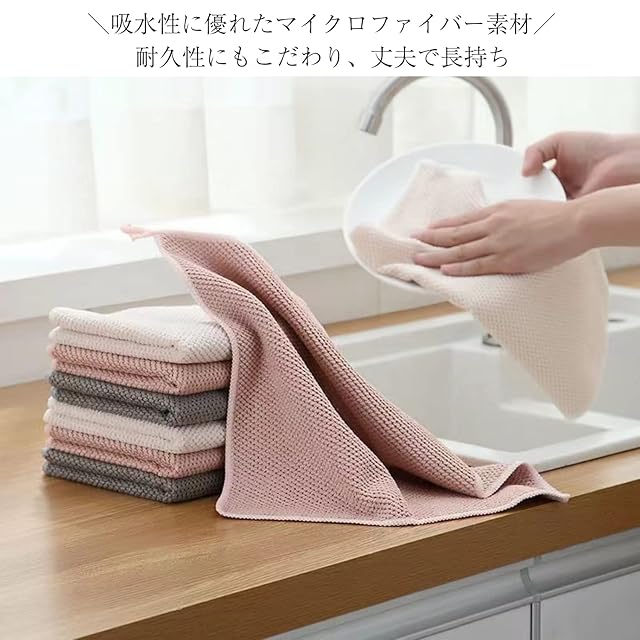 【耐久性良く丈夫】キッチンタオルの生地がマイクロファイバーを採用し、丈夫で長持ち。食器が洗った後の水拭きとして使われば、半年ぐらい続けて使えることが可能。毛羽立ちもほとんどない。