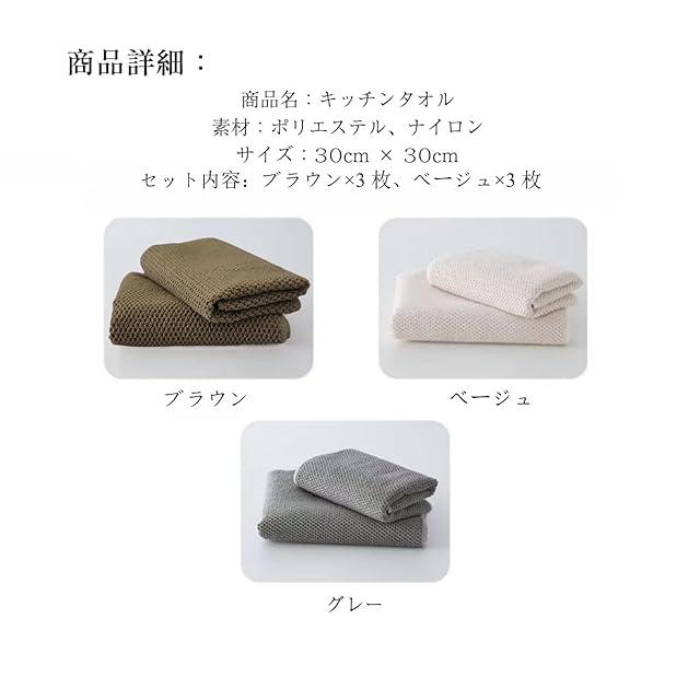 【厚手生地で吸水性に優れる】キッチンタオルは吸水性に優れたマイクロファイバーを採用し、食器の水分がサッと吸い込まれて使いやすさにこだわりました。また、速乾性も良く洗濯後に素早く乾きます。セット内容:ベージュ×3枚、ブラウン×3枚。サイズ:約30×30cm 重さ:約30g(1枚あたり) 材質:ポリエステル、ナイロン カラー:2色展開(ブラウン、ベージュ)