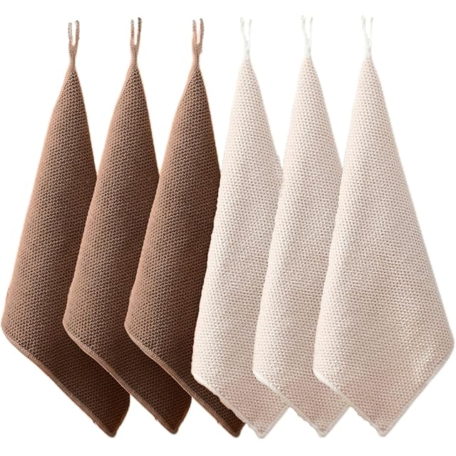 キッチンタオル キッチンクロス ふきん 手拭きタオル 布巾 台拭き ディッシュクロス ループ付き 速乾キッチン 食器拭き 30*30cm 6枚セット 吸水性 台所 手ふきん タオル 速乾 防臭 北欧 おしゃれ 衛生 抗菌 おしゃれ マイクロファイバー 毛羽立たない(ベージュ3枚 ブラウン3枚)