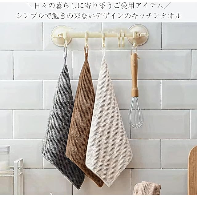 【使いやすいサイズ】台拭きあるいは食器拭きとしては最適なキッチンタオルが、ループも付属しており使わない時の収納も楽で衛生的。30*30cmサイズでキッチン用としてちょうど良く、三色をワンセットにして、色違いで食器拭き、台拭きと使い分けられる。