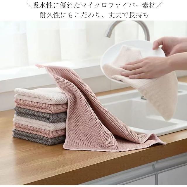 【耐久性良く丈夫】キッチンタオルの生地がマイクロファイバーを採用し、丈夫で長持ち。食器が洗った後の水拭きとして使われば、半年ぐらい続けて使えることが可能。毛羽立ちもほとんどない。