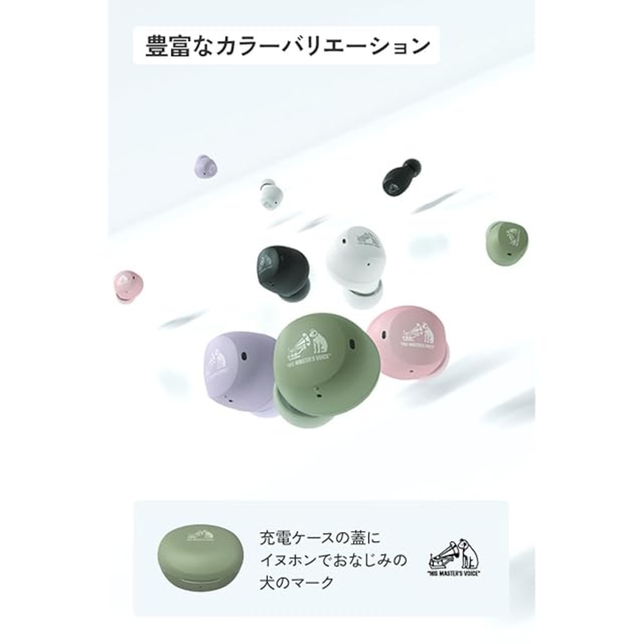 【トレンドを意識した5色のカラーバリエーション】 カラーバリエーションはトレンドを意識したピンク、パープル、グリーンに、ベーシックカラーのブラック、ホワイトを加えた5色をラインアップします。また、イヤホン本体と充電ケースには、Victorブランドの象徴である「犬のマーク」をデザインしています。