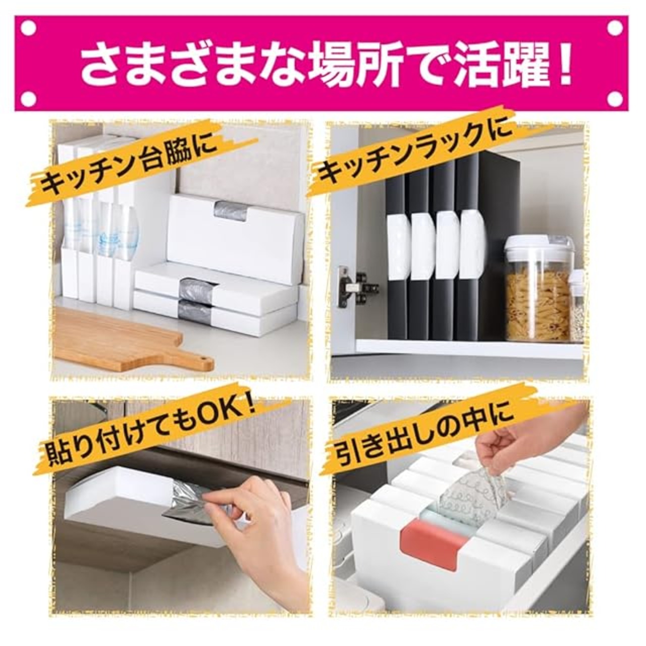 【お得な4個セット】4個セットなので、ゴミ袋やポリ袋、フリーザーバッグなど袋類を種類ごとに収納いただけます。組み立ても簡単にできますので、ぜひ素敵なキッチン周りにお役立てください。