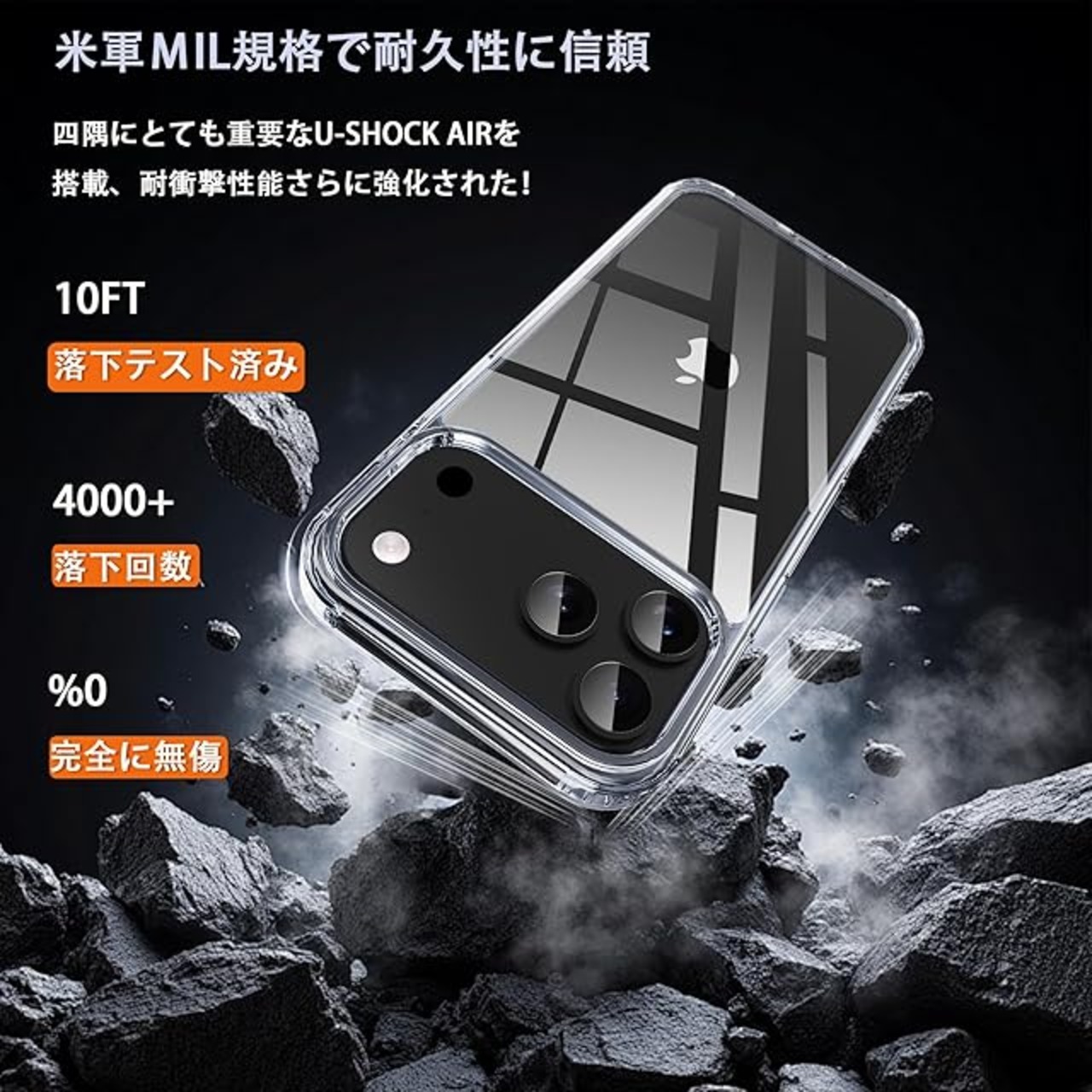 【MIL規格の耐衝撃設計】 米軍MIL規格の衝撃吸収ポケットを四隅に内蔵。様々な角度から落下させる実験をしたところ、本体に傷はつきませんでした。高い耐衝撃性を誇り、本体を全方位からしっかりと守ります。