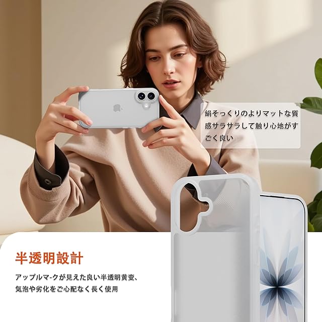 【半透明・マット仕上げ】背面は耐久性や耐摩耗性に優れたポリカーボネート使用。表面には指紋防止ナノコーティングを施しており、指紋がつく心配もありません。マットな質感でサラサラした触り心地。背面は半透明なので、リンゴマークが透けて見えるようになっています。高級感も併せ持ったケースです。