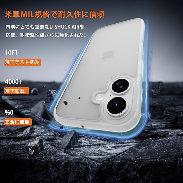 【MIL規格の耐衝撃設計】 米軍MIL規格の衝撃吸収ポケットを四隅に内蔵。様々な角度から落下させる実験をしたところ、本体に傷はつきませんでした。高い耐衝撃性を誇り、本体を全方位からしっかりと守ります。