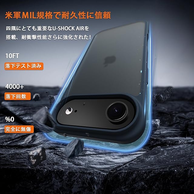 【MIL規格の耐衝撃設計】 米軍MIL規格の衝撃吸収ポケットを四隅に内蔵。様々な角度から落下させる実験をしたところ、本体に傷はつきませんでした。高い耐衝撃性を誇り、本体を全方位からしっかりと守ります。