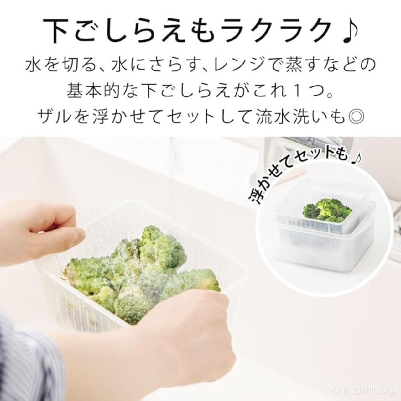 ザルがついた便利なレンジ調理・保存容器で、レンジで蒸す、水を切る、水にさらすとこれ一つで下ごしらえ!おいしくヘルシーな温野菜や蒸し調理が簡単にできちゃいます♪