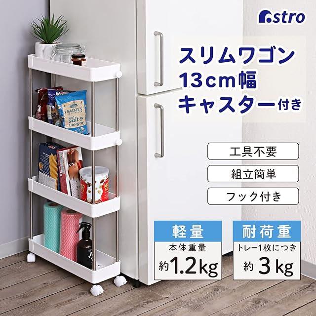 アストロ 【使い方動画あり】 キッチンワゴン ホワイト スリム 4段 キャスター付き 収納ワゴン キッチンラック 収納カート 調味料ラック 隙間収納 310-28