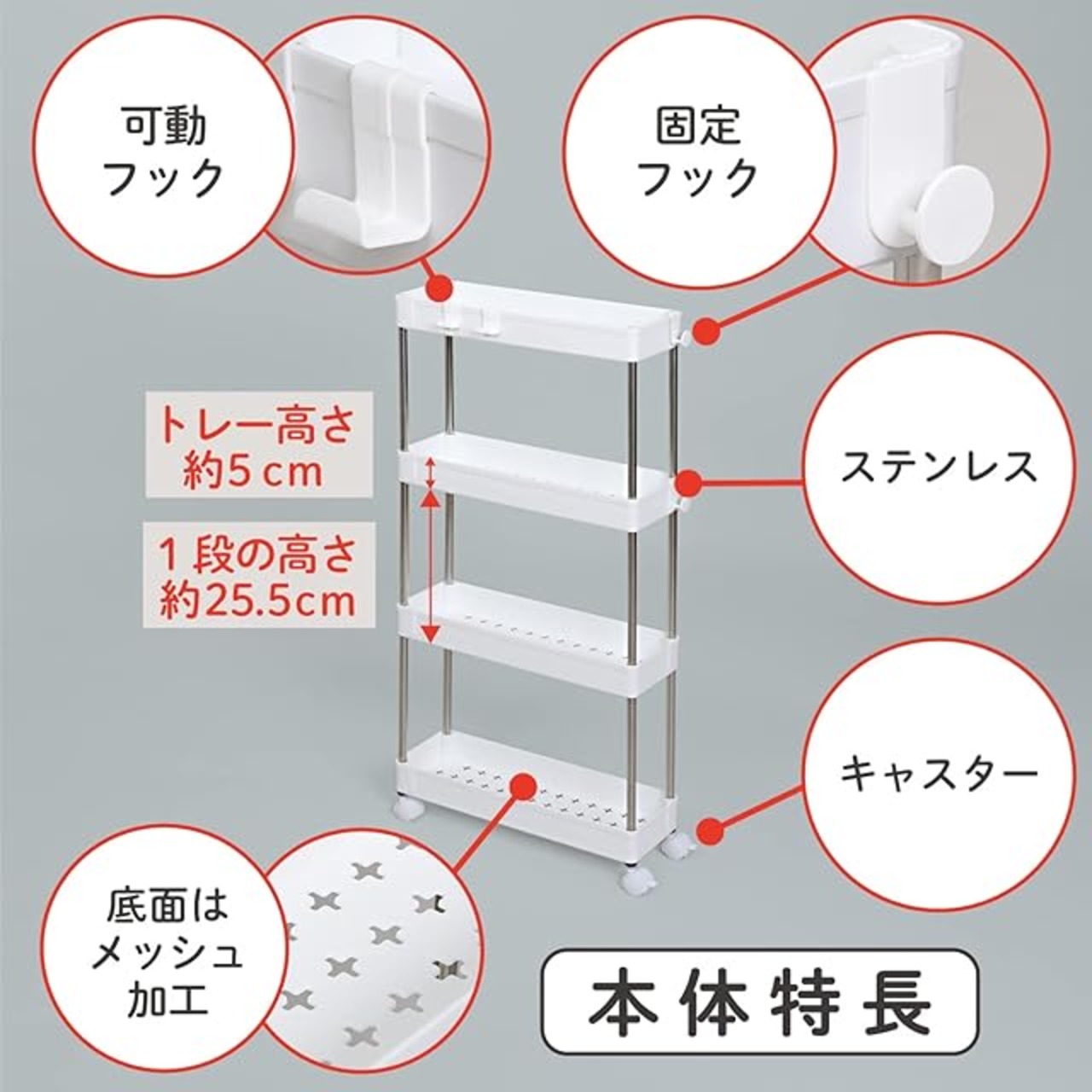 【商品仕様】:サイズ/約幅13×奥行40×高さ85cm(キャスター含む)、カラー/ホワイト、内容/1台、耐荷重/トレイ1枚につき約3kg、材質/ポリプロピレン・ステンレス