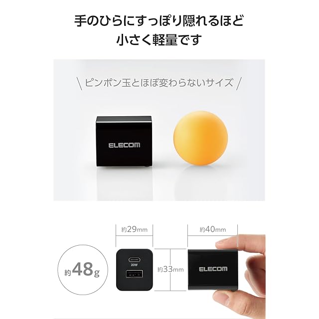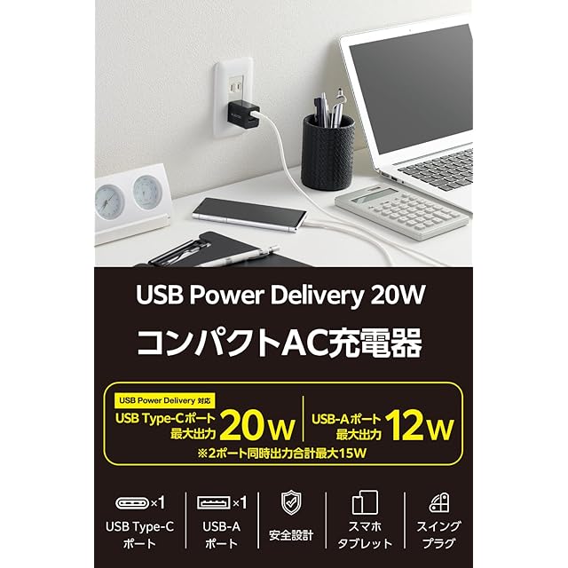 商品名:エレコム Type-C 充電器 20W USB PD対応 2ポート USB-C USB-A 【iPhone 16 15 14 Android 等対応】 ブラック EC-AC22BK