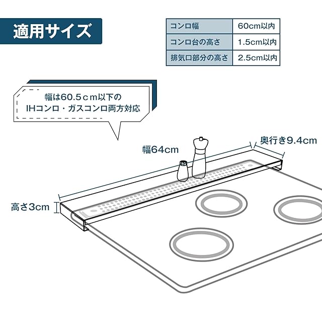 【製品仕様】ガスコンロ カバーサイズ:幅64cm×高さ3cm×奥行き9.4cm、耐熱: 約200℃、重量: 700g。幅は60.5cm以下、高さ2.5cm以下のIHコンロ・ガスコンロ両方対応。製品購入後、ご不明な点がございましたら、お気軽にお問い合わせください。