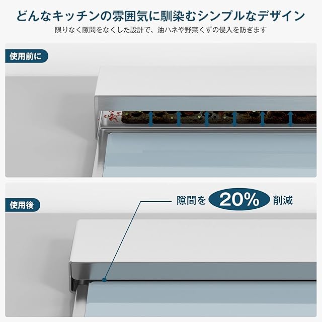 【空間を有効活用&排気口保護】排気構カバーの奥行きは9.4cmのなので、油汚れカバーだけではなく、上には調味料や鍋等を置いてラックとしても使うことができます。グリルを使用する時やストーブの掃除が必要なときは、取り出せるのでやすくなっています。