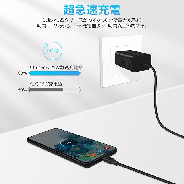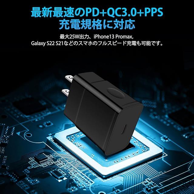 <b>ChrisPow 最新、最速、そして最も効率的のUSB充電技術、PowerDelivery、QuickChargeとPPS規格を3つ備えてな25W USB-C急速充電器</b><br><br> <b>製品の仕様</b><br> - パッケージ:USB-C電源アダプター + USB-C&USB-C充電コード<br> - サイズ:約50 x 42 x 22mm;ケーブルの長さ:約1.83m<br> - 重さ:充電器約50g;コード:約45g<br> - USB-C出力:5V=3A;9V=2.77A<br>PPS3.0 対応--3.3-5.9V=3A; 3.3-11V=2.25A; 12V=2.25A<br> - 入力:100-240V 0.5A 50-60Hz<br> - ポート:USB-C<br><br> [3つ充電技術が1個で済む]:PowerDelivery、QuickCharge3.0およびPPSの3つ充電技術を通じて高速と効率的に充電を提供します。Cポートで急速充電できてAndroidおよびiOSデバイスに最適な高品質充電アダプターです。<br> [幅広い互換性]:USB-C搭載により、あらゆるUSB機器にフルスピード充電が可能です。iPhoneやGalaxy、Xperia、OPPOなどの各種Androidスマートフォンとの互換性がありますが、11インチiPad Proや12.9インチiPad Proにも最も優れた充電パフォーマンスを発揮します。<br> [25W/3A急速充電]:スマホ急速充電器は最大25Wで、一般的な5W出力の充電器に比べ、最大3倍速く充電できます。QC2.0より1.4倍です。クイックチャージ技術(1.0、2.0、3.0)などおよび非急速充電デバイスと互換性があります。<br> [コンパクトデザイン]:コンパクト設計、カバンにスムーズに収納し、どこにでも気軽に持ち運ぶことができます。AC100-240Vに対応しますので、海外旅行でも持ち行きます。<br> [使用安心安全]:独自の多重保護システムがサージ保護やショート防止、温度管理などの優れた機能を提供し、長期間お使いいただけます。<br><br> <b>対応機種</b><br><br> ( 本製品はUSB-C & USB-C ケーブルとのセットです。iPhone機種充電場合にUSB-C & ライトニングケーブルは別売りです。)<br><br> ANDROID機種<br> 「SAMSUNG」--Galaxy M23,S22,F52,S21,S20,S20plus,S20ultra,S10,S10plus,S10e,S10lite,S9,S9plus,S8,S8plus,S7,S6;<br> --A10e,A20e,A20,A20s,A30,A31,A30s,A40,A40s,A41,A50,A50s,A51,A52,A71,A71 5g,A70,A70s,A60,A80,A81,A90,A91;<br> --Note 8,Note9,Note10,Note10+,Note10lite,Note20,Note20ultra,C5pro,C7pro,C9pro;<br> 「SHARP」-- Aquos Sense6s,Sense6,Sense5G,Sense4 plus,Sense4 lite,Sense4,Sense3 plus,Sense3 lite,Sense3 basic,Sense3,Sense2,Sense,zero2,wish,R6,R5G,R3,R2,R;<br> 「OPPO」--Reno7 A,Reno5 A,Reno3 A,Reno A,Find X3 Pro,Find X2 Pro,A73,A55s 5G,A54 5G,A5 2020,AX7,R15<br> 「SONY」-- Xperia Ace III,1III,1II,5III5II,10III,XZ,XZ1,XZ1compact,XA1,Xcompact,XZ2,XZ2compact,XZ2premium,Z3,Z3compact,Z3tablet compact,Z4tablet;<br> 「ZET」-- M Z-01K;HTC U11,10;KYOCERA BASIO3,digno J,S2;FUJSU F-01L,F-04K;<br> 「HTC」 --U11 Eyes,U11+,U11,HTC10,U11life,10evo,Uultra,Uplay;<br> 「Google」 --Pixel 6/6A,Nexus5X,6P,GooglePixel2,Pixel2XL;<br> 「Android」 --One X1,X2,X3,S3,S4