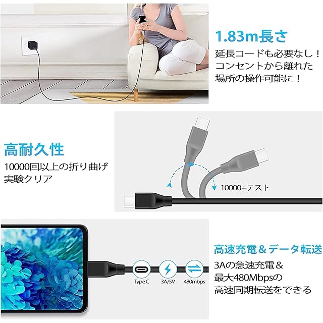 ❤【USB Type-Cケーブル・高耐久・急速充電・クイック転送】:[充電コード長さ:1.83m 重さ:45g]、タイプCケーブルは一般的のより5倍以上の持続力を持ち、折り曲げに対して圧倒的な耐久性を実現しました。最大480mbpsのデータ転送速度も実現。多くのUSB-C機器に対応し、最新のGALAXY M23,Googl Pixel 6/6A,Xiaomi 11T Pro,OPPO Reno5a 7a,iPhone SE(第3世代)/13/12だけでなく、スマートフォン、iPad Pro等のタブレット端末、MacBook Air等のノートPCにご利用いただけます。
