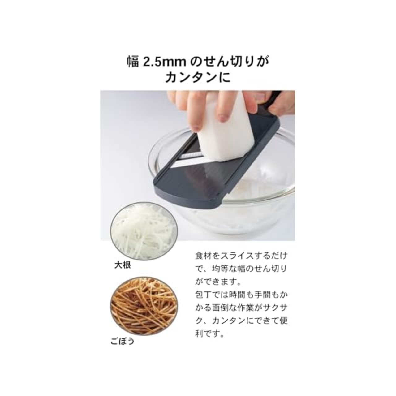 【せん切りが簡単に】幅約2.5mmの櫛刃と鋭い切れ味のセラミック刃で、野菜のせん切りが手早くできる(大根・人参・きゅうり・ゴボウなど)