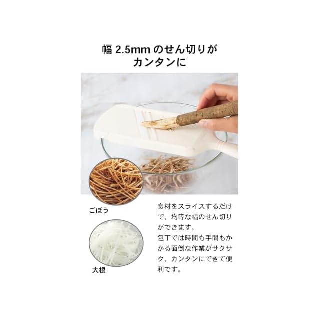 【せん切りが簡単に】幅約2.5mmの櫛刃と鋭い切れ味のセラミック刃で、野菜のせん切りが手早くできる(大根・人参・きゅうり・ゴボウなど)