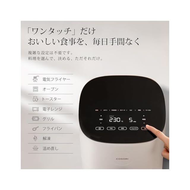 【豊富な調理モード】高級感のあるタッチパネルで簡単に操作できます。鶏肉、ポテト、冷凍食品、ステーキ、魚、野菜、ベーコンなど、9種類のプリセットが用意されています。調理時間は最大60分まで設定でき、温度は最大230℃まで調整できます。当ページでは取扱説明書(ユーザーマニュアル)と特製専用レシピ(ユーザーガイド)をダウンロードできますので、ぜひご活用ください。家族や友人へのプレゼントとしてもおすすめです。
