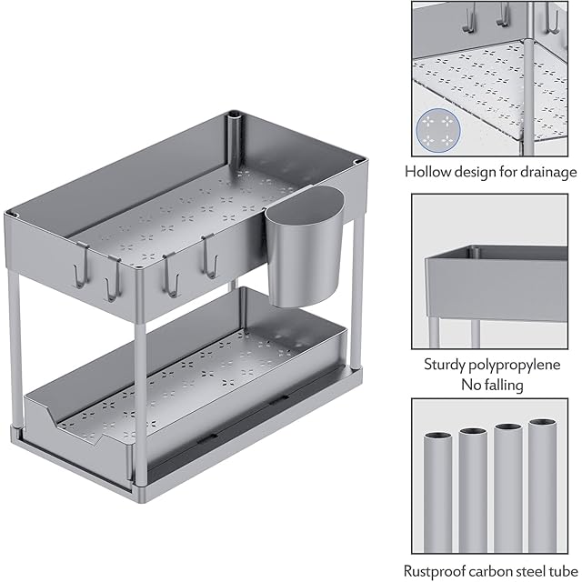 ✅ 4つのサポートスチールチューブ、コーティング、防錆、耐荷重、揺れにくい; 2段バスケット、中空デザインで排水性が良く、水が溜まらない; お手入れは簡単、湿らせた布で拭いてください。