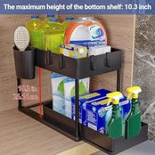 説明: Puricon Under the Sinkオーガナイザーは、キッチンやバスルームのアイテムを整理し、パイプ用のスペースを作るように設計されています。 下部のスライドアウト引き出しにより、後ろに隠れているものを簡単に持ち運ぶことができます。曲がることはありません。