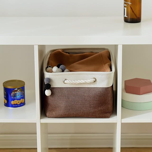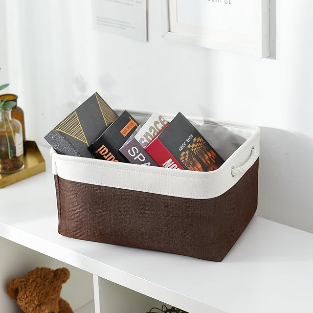 TheWarmHomeかご バスケット 収納 かご 35cm×25cm×17cm 収納ボックス カゴ 小型ランドリーバスケット 綿麻製 布製 おもちゃ収納 衣類収納 折り畳む式整理用バスケット おしゃれなインテリア雑貨 高耐久性 ハンドル付き ホワイトブラウン