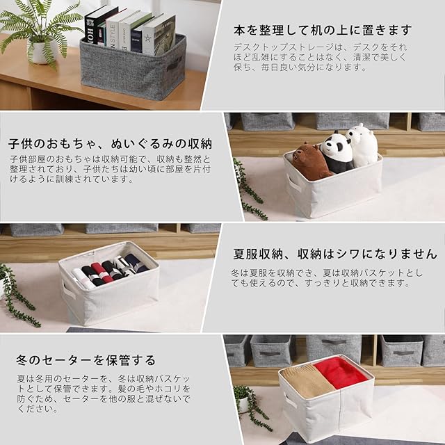 【シナリオマッチング】収納ボックスは、寝室、居間、書斎、収納室、オフィスなど、さまざまなシーンで使用されています。 サイズは2種類あり、収納ボックスのサイズと数量は以下のように選択します。 製品の色は新鮮で、さまざまな装飾スタイルに合わせることができます。 素材は環境にやさしく、洋服やおもちゃの収納に適しています。収納ボックスは大容量で、さまざまな洋服やおもちゃ、本を収納できます。また、収納ボックスにはPPボードが内蔵されています。しっかりしていて、何度も洗うことができ、変形しにくいです。