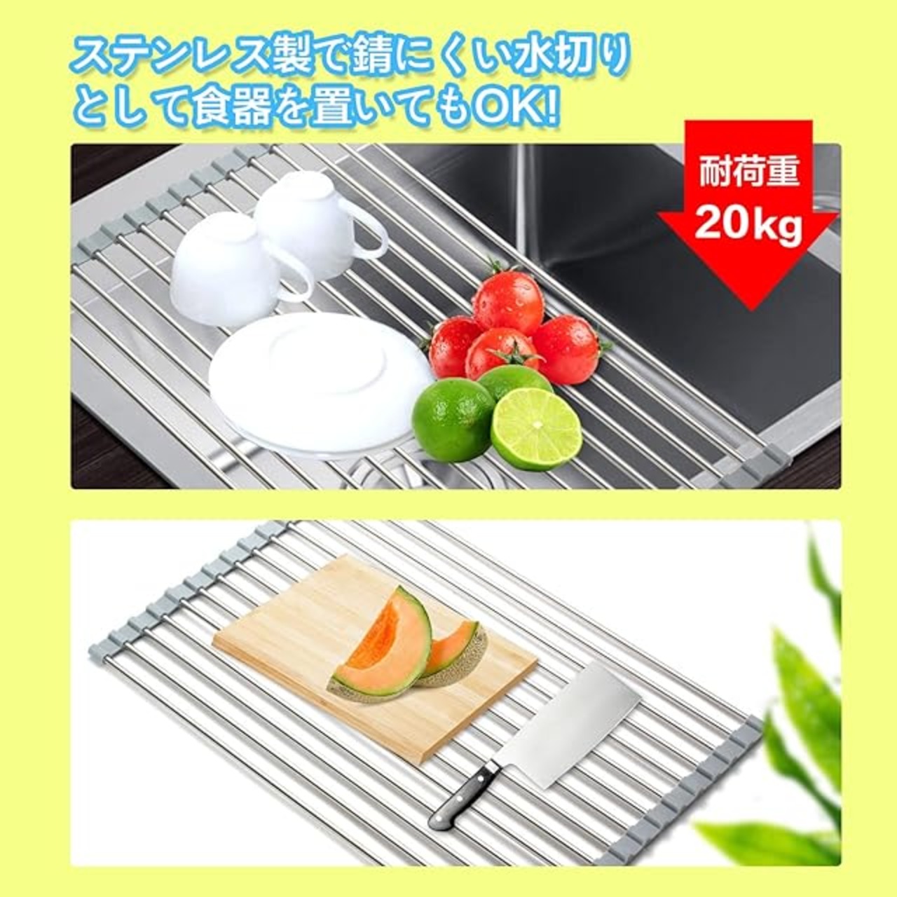 <b> 【商品一覧】 </b> <br> 商品名:水切りラック <br> 材質:ステンレス+シリコン <br> サイズ:52 *35 *0.8cm;44 *30 *0.8cm <br> 重量:405g(大);295g(小) <br> <b> 【商品特徴】</b> <br> 1、最大耐荷重20kgまで活躍します。 <br> 2、耐熱250度、熱い鍋を入れてもOK。 <br> 3、収納がフレキシブルで、ロールもラクラク。 <br> 4、滑り止め設計、両端はシリコン素材を採用、非常に安定です。 <br> 5、安心サポート、1ケ月の安心が付きます。