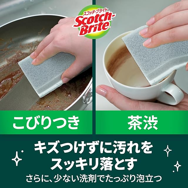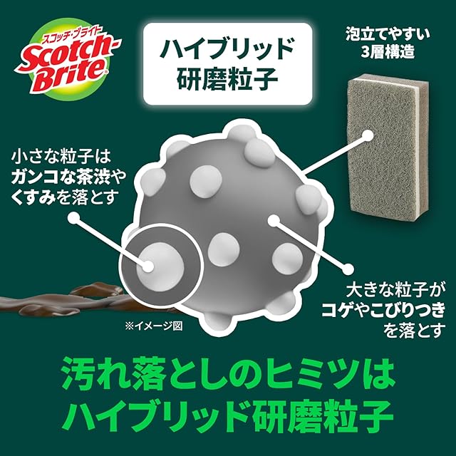 【頑固な汚れもスッキリ落とす、ワンランク上のスポンジ!】ハイブリッド研磨粒子配合で、茶渋や着色汚れ、油汚れからコゲつきまでパワフルに落とせます。