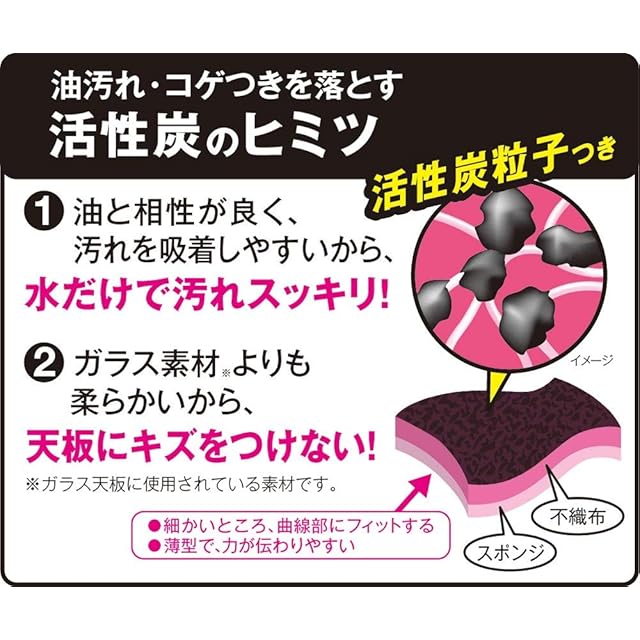活性炭粒子は、油と相性がよく、汚れを吸着しやすいため、水だけでコンロ周りの汚れをしっかりと落とすことができます