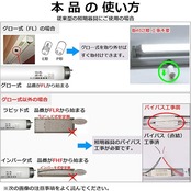 ご注意事項※ 本製品は両側給電仕様の為、片側給電式やラピッドスタート,インバーター式のご利用は危険ですのでお控えください。尚、バイパス工事が必要な場合、電気工事業者にご相談ください。