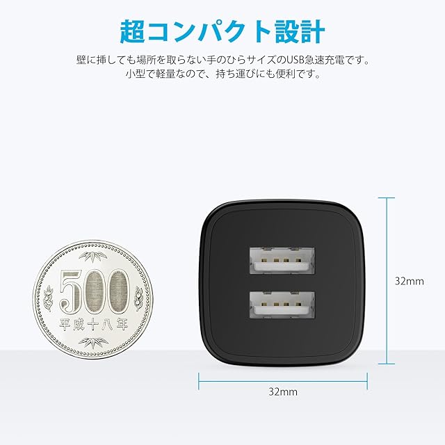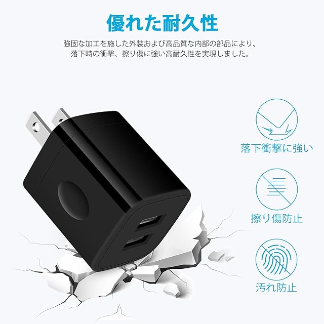 <b>仕樣:</b><br> USBコンセント 2ポート*1個(全黒) <br> 電源入力:AC100V~240V<br> 電源出力:2.1A<br> 充電器サイズ:3.2*3.2*3.7cm<br> 重量:約30g<br><br> <b>充電器について:</b><br> ❶充電器が1個付きていて、スマホやiPhoneなどのUSB充電の携帯に対応してます。<br>電源はAC100~240Vに対応しております。最速のスピードでタブレット、モバイルバッテチ、ルーターに充電させます。<br><br> ❷ICチップを持つ充電器は、回路保護システムにより、過電圧、過放電、過熱保護機能搭載を持ち、<br>および回路のショートを防げ、アダプタの発火などを防止します。バッテリー充電終了時に自動的に停止しています。<br><br> ❸携帯しやすいコンパクトサイズ:軽量とコンパクトな手のひらサイズで持ち運びも楽々、邪魔にならない小型サイズです。<br>持ち運びに便利で、お家だけでなくお出かけや旅行、会社にも手軽に持ち運ぶことができます。<br><br> ❹12月付き: お客様に安心してご購入お使い頂けるよう、ご購入後12ヶ月間の、長期を設けております。<br>初期不良、使用中の自然故障など万一この期間中に製品がご使用頂けなくなった場合、交換対応をさせていただけます。 <br><br> <b>充電器の互換性が広い:</b><br> -iPhone11/11pro/11pro max,PhoneXr/Xs/Xs max/X,iPhone 8/8 Plus,iPhone 7/7 Plus,iPhone 6s/6s Plus, SE, 5, 5C,5S ,4S ,4 <br> -iPad Air 2,iPad Pro, Mini 2/3/4/5, iPod Touch<br> -Galaxy S10/S10+/S9/S8/S7/S7 edge/S6 edge plus/S5/S4/S3/S2/5/4/3/2 Mega, tablets<br> -Nexus 6P 5X, One-plus 2, One-plus One, HTC, LG, Nokia<br> -MP3 Players, Smart-phones, E-book Readers, Bluetooth Speaker, GoPro, Nook Hd+,などに対応します。<br>