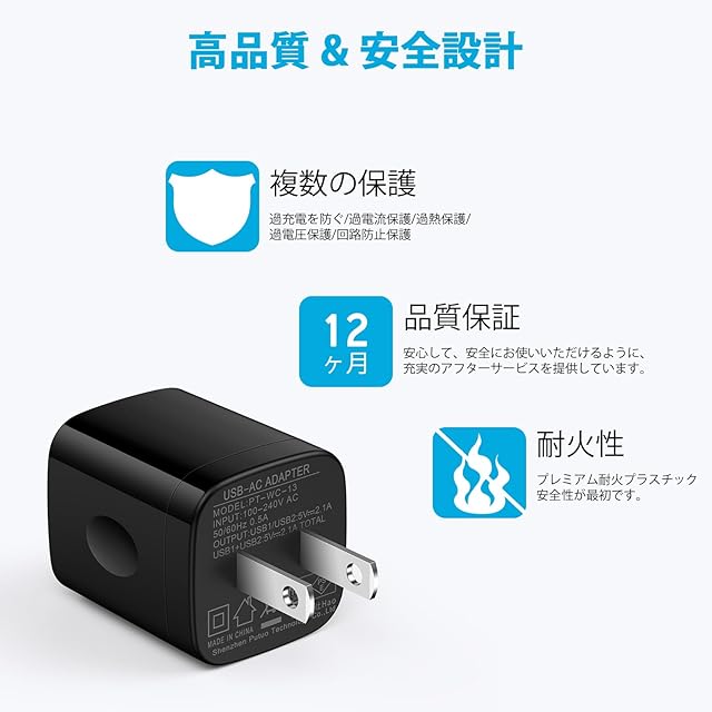 ★ 使用安心:防火カバーとスマートICの識別デザインです。自動検測機能付き:デバイスに最適な電流を接続することが自動検測と提供できます。過熱保護、過電流保護、過充電保護の知能ICデザイン、バッテリー充電終了時に自動的に停止しています。PSE認証も合格しましたので、安心してご利用いただけます。