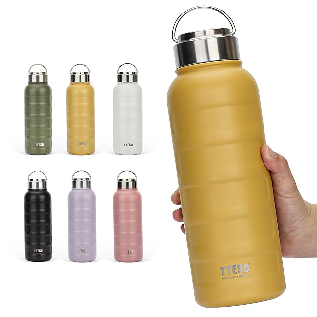 TYESO 水筒 魔法瓶 マグボトル 真空 断熱 スポーツボトル 直飲み ステンレス 2重構造 広口 ハンドル付 大人 子供 0.75 / 1リットル (1000ml, イエロー)