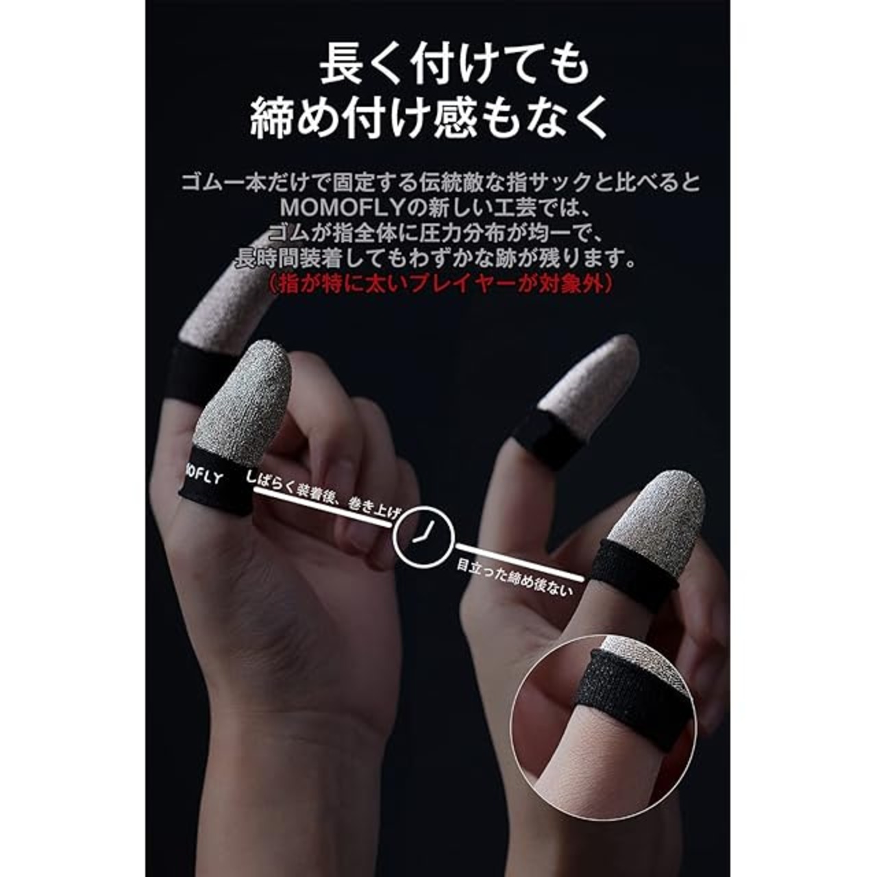【本当に締付感なく、ゲーム10回プレイしてもわずかな跡だけ残る】本製品はMOMOFLY最新技術-TC22を用いて、付け根の部分を作ります。伝統的な1本のゴムで固定する指カバーは、圧力を指の1カ所に集中させ、長時間装着すると痛くなり、明らかな締め跡があります。新製品はゴムで縁取りする方式を廃止し、優れた弾力をすると同時に、圧力を指全体に分布し、長時間装着してもわずかな締め跡が残るだけである。