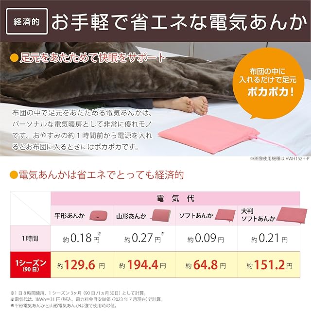 <b>仕様</b><br> <ul> <li>商品タイプ:山形電気あんか</li> <li>色・柄:パープル</li> <li>サイズ:約D 22 × W 24.5 × H 8 cm</li> <li>重さ:約0.98kg</li> <li>組成 <br> 表面材質:ポリエステル100% <br> 中材:ウレタンフォーム</li> <li>消費電力:60W</li> <li>電気代:約0.27円(1時間当たり ※強で使用)</li> <li>電源コード長:約2m</li> </ul> <br> ※電気代は、1kWh=31円(税込、電力料金目安単価)として算出した値。<br> ※新電力料金目安単価は2023年7月現在の値となります。