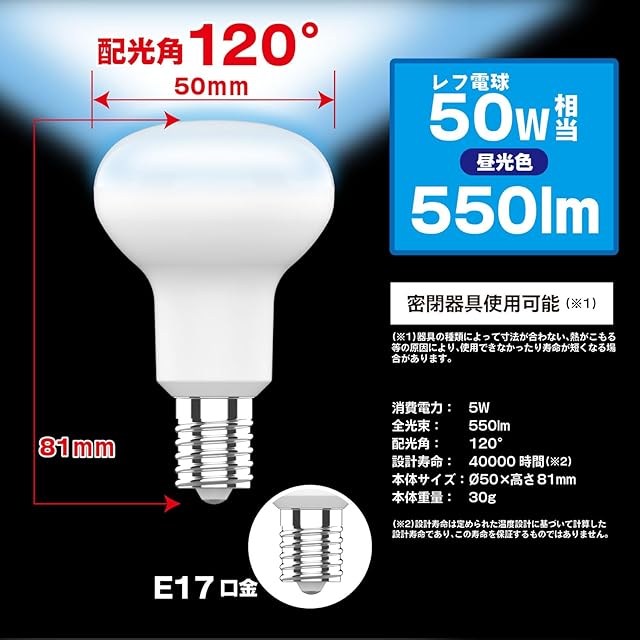 全光束:550lm(レフ電球50W相当)/消費電力:5W/消費効率110.0lm/W