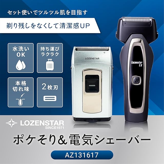 【セット品】 ロゼンスター シェーバー 水洗いポケそり 2枚刃 乾電池式 WET剃り可能 超小型 + 電気シェーバー 2枚刃 IPX5 メンズシェーバー ヒゲ剃り 充電交流式 急速充電 AZ131617