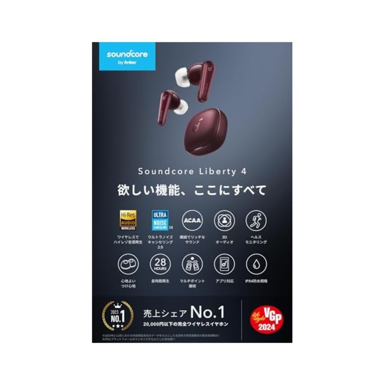 商品名:Anker Soundcore Liberty 4(ワイヤレスイヤホン Bluetooth 5.3)【完全ワイヤレスイヤホン/ウルトラノイズキャンセリング 2.0 / 3Dオーディオ / ワイヤレス充電/マルチポイント接続/外音取り込み / 最大28時間再生 / ハイレゾ / IPX4防水規格 / ヘルスモニタリング/PSE技術基準適合】ワインレッド