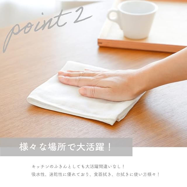 【泉州タオルの特徴である優れた吸水性】生地を織り上げた後に綿花の油分や不純物・糊を洗い落とす「後晒し製法」により吸水性に優れ、使い始めから吸水性にがいいです。※柔軟剤の使用は吸水性を疎外するので、できるだけ使用しないでください。※吸水性に優れていますが、パイル(タオルのループ部分)がないので、お客様によっては拭ききれないと感じるられる場合もございます。ご了承ください。