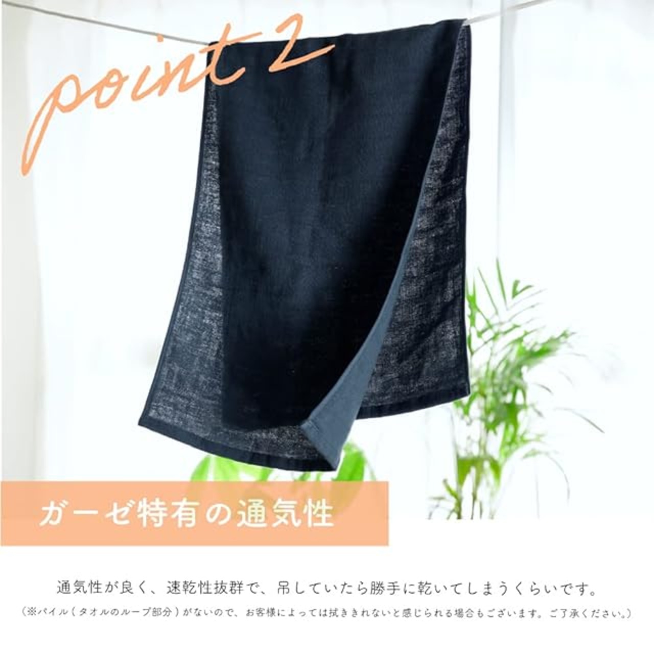 【吊していたら勝手に乾いてるくらいの超薄手速乾】ガーゼを2層重ねて織ったダブルガーゼタオルで、ガーゼの持つ通気性により、吊していたら勝手に乾いてるくらいの速乾性を持ちます。