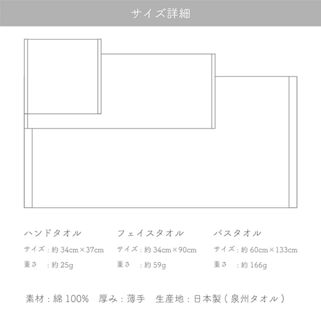 【フェイスタオル同色3枚セット】生産地:日本製(泉州タオル) 本体重量:59g(1枚あたり) 本体サイズ:約34×90cm(1枚あたり) 素材 : 綿100%