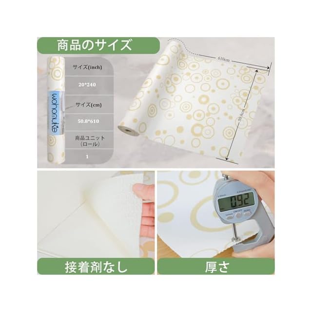 商品名:wohomuke 食器棚シート50.8x610cm シェルフライナー キッチンシート PVC製 保護マット 滑り止め 抗菌 防カビ 収納シート 引き出しシート 冷蔵庫マット 本棚マット 自由裁断 滑り止め性能(丸柄,50.8x610cm)