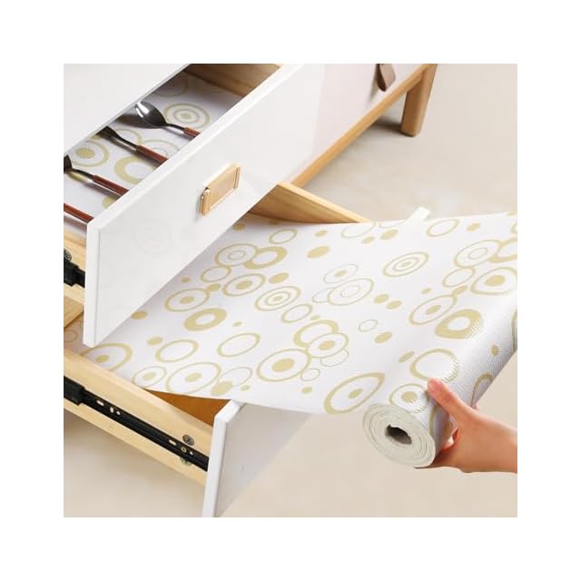 【色の追加】他の通常の無地の棚ライナーとは異なり、装飾的なタッチも加える滑り止めマットを求めるさまざまな顧客のニーズを満たすために、金色の円形テクスチャデザインを作成しました。当社の棚ライナーを使用して、冷蔵庫、棚、キッチン、バスルームを装飾してください。棚ライナーは、キッチンにパターンと色を導入する強力な手段です。